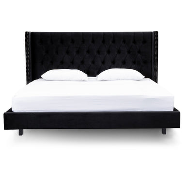 Frame and bed head upholstered in black velvet Button tufted and padded bed head with brass studding Strong hardwood frame and included slats Bed ...
