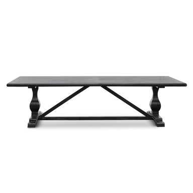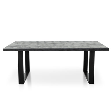 Recycled elm wood table top finished with a matte black colour Black powder coated metal looped legs Seats 6-8 people All produ...