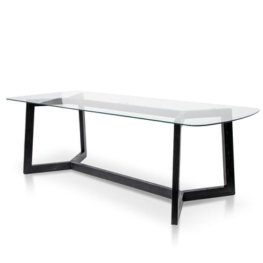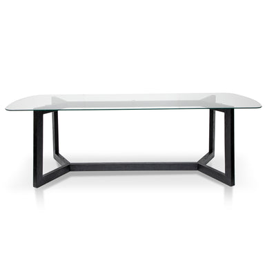 Rounded rectangular glass table top Solid black elm wood base and legs Clear rubber suction cup holders for glass Seats 6-8 people Two-person asse...