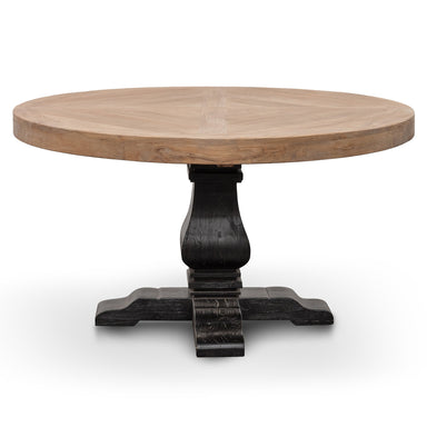 Hand-crafted from recycled timber with elm wood construction Round table top with natural untreated finish Pedestal base in contrasting black pal...
