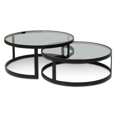 Tempered glass in a polished and tinted finish Steel frame construction in matte black Circular nest tables in a compact size Linear base featurin...