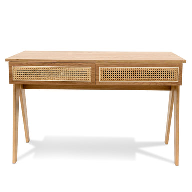 Natural color MDF with oak veneer cabinet Rattan weaved drawer front A-shaped tapered solid oak legs Product comes flat pack and requires assembly...